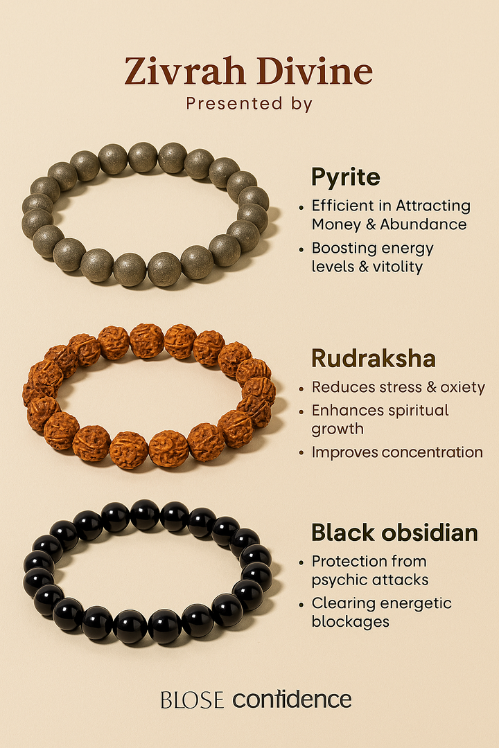 This Triple Power Bracelet Combo combines the calming energy of Rudraksha beads to promote peace, the energizing properties of Pyrite to attract success, and the protective strength of Obsidian to shield against negativity. Expertly crafted, this bracelet serves as a balanced accessory to support your mental clarity, ambition, and spiritual well-being throughout your day.