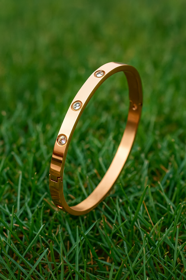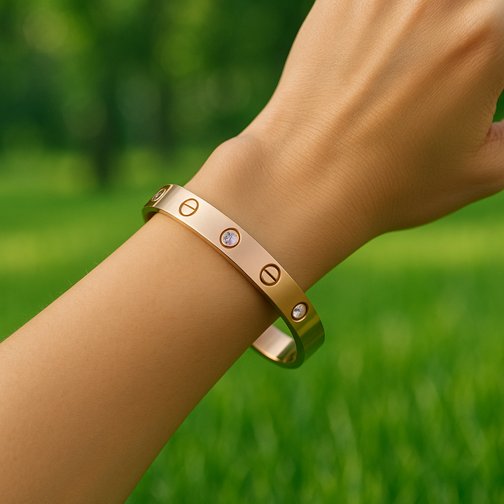 Elevate your accessory collection with this Celebrity Luxury bronze stainless steel screw kada, crafted for women and girls. Featuring an anti-tarnish finish, this cuff bracelet maintains its polished look over time while offering durable wear. Its sophisticated design and secure screw closure provide both style and practicality for any occasion.