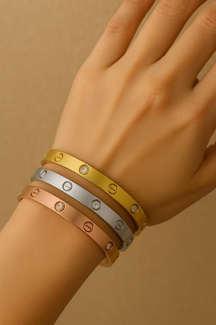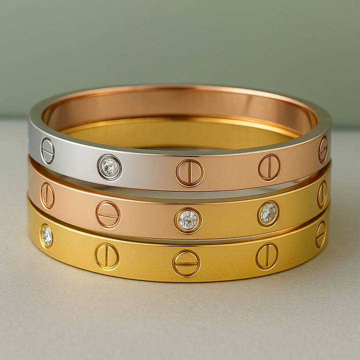 Elevate your style with this Celebrity Luxury 3-in-1 Kada Combo designed for women and girls. Crafted from durable stainless steel, this set includes golden, silver, and bronze screw kadas, offering versatile looks in one collection. Featuring an 18k gold-plated bracelet with an anti-tarnish finish, it ensures lasting shine and minimal maintenance. Perfect for adding a sophisticated edge to both casual and formal outfits, this combo balances elegance with everyday wearability.